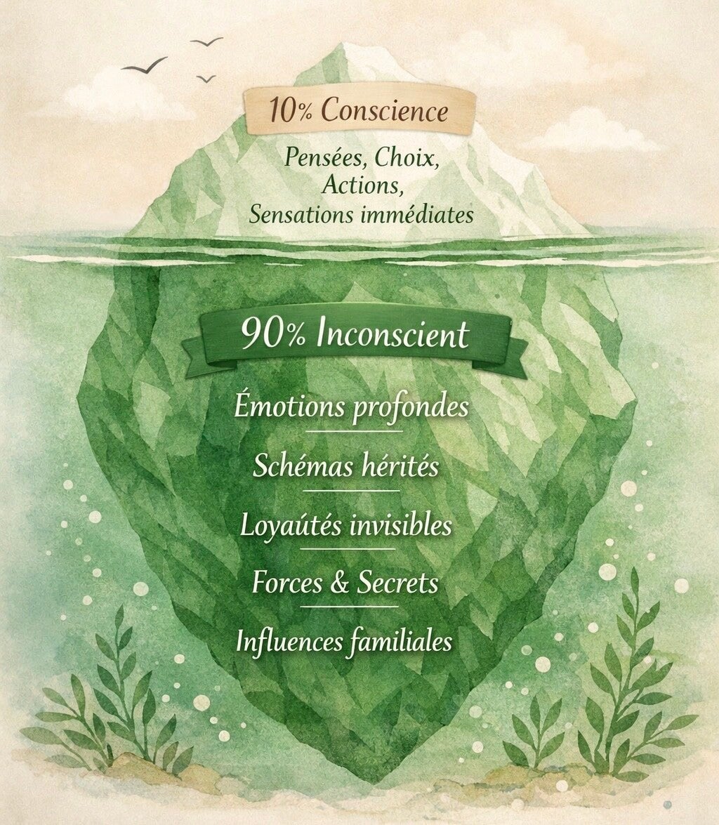 On peut imaginer chaque être humain comme un iceberg : le petit sommet visible au-dessus de l’eau représente notre conscience, nos pensées, nos choix — environ 10 % de notre être. Mais sous la surface se cache l’immense partie immergée, l’inconscient, vaste et mystérieux, où se trouvent nos émotions, nos loyautés invisibles et les schémas hérités de notre famille — ces 90 % qui influencent silencieusement notre vie.